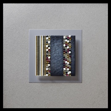 glass wall art uses black satin, white, amber and red glass to create a formal