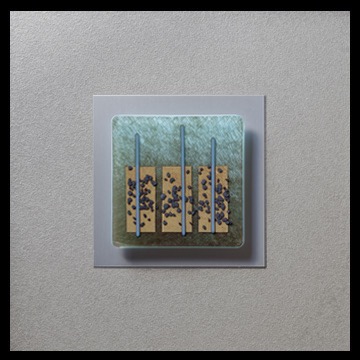 multi-layered reactive glass, silver leaf, and frit wall art. A larger piece, "Fool's Gold," and additional miniatures are ready for mixing and matching for an impressive and shimmering wall display.